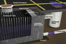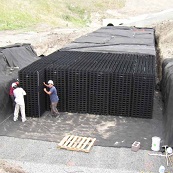 is a plastic structure used to store storm water underground. Made from injection molded plastic, a single panel contains 36 vertical columns and exceeds H-20 loading, allowing the construction of driving areas, parking lots, or other small structures above the system. Built-in compression fittings allow units to easily stack to a variety of depths up to 8'4".
