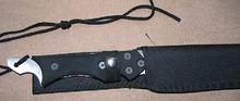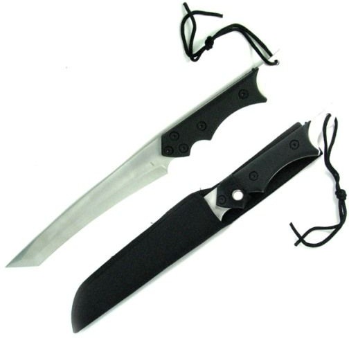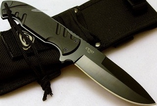 Model CT286 Tactical Fighter is a Black coated drop point 10.5” overall, 8Cr14 Stainless Steel blade, Black cast metal handle, thumb ridge, with a lanyard hole to the back. A sheath is also included. [See Photo At Left]