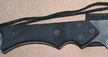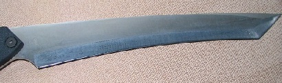 The finger grooves are in all the right places… even Goldilocks would be jealous. The Black rubber handles are secured with Allen screws…unlike the riveted kind that fall apart. It also features an 11.25” Tanto blade with an overall length of 19.25”. Weight and balance Is good due mostly to the full blade/ handle shaft.