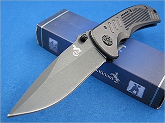 Model CT357 Tactical knife is a Black coated drop point 8.25” overall, 440A Stainless Steel blade, Black smooth aluminum handle w/ lanyard hole to the back. A sheath is also included. [See Photo Right]