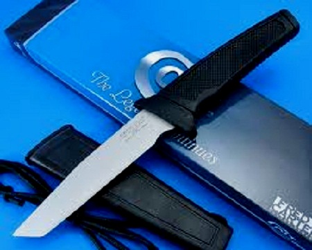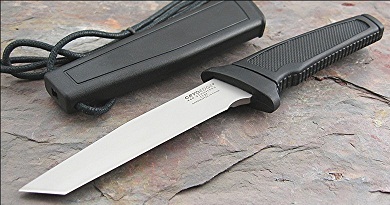 Model CT57 Guardian Tactical was designed by custom knife maker Fred Carter. The knife is a Tanto point 8” overall, 440A Stainless Steel blade, CryoEdge treated to -300 degrees. Black checkered ABS handles. A sheath is also included. [See Photo At Left]