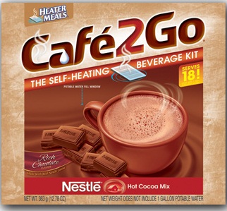 HeaterMeals 3 & HeaterMeals EX Self-Heating Meal Kits are higher in protein, fiber content, as well, yet lower than MREs in cholesterol, fat, and sodium. In fact HeaterMeals Kits contain no Trans Fats. Cafe2Go serves 18 Hot Beverages in minutes. "Everything to Enjoy A Hot Beverage Anytime, Anyplace.”