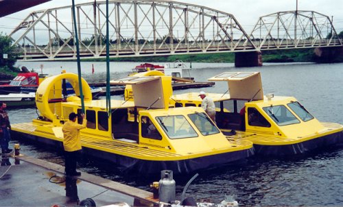 Vanair Hovercraft Canada produces the V-18 “Vanguard” 18 passenger hovercraft for Law Enforcement, Search & Rescue, Water Taxi and Personal Watercraft. In addition to this craft they produce the V-9 “Vixen” 9 passenger. Production of heavy equipment transports and other commercial applications are also available. Hull & Super Structure: Aluminum – Length: 36' 4 in / 11.05M, Width side structures on; 14' 5"/ 4.41M, side structures off: 8' 5"/ 2.59 M, Height off cushion: 10' 2"/ 3.10 M, Max Gross Weight: 15,200 lbs/ 6909 KG, Max Payload: 6000 lbs/ 2727 KG, Obstacle Clearance: 18"/ 0.45M, Fuel Capacity: 60 GAL/ 271 LT, Engine: Cummins Diesel 350 HP, Seating Capacity w/Operator: 19, Cruise Speed on water: 35 mph/ 56 kph, Fuel Consumption with full payload: 7.3 gal/hr/ 33 litres/hr, Endurance: 8 Hrs, Max Operating Wave Height with full payload: 39 inches/ 1 Meter, Braking: Full Reversing Propeller, Pitch & Trim Control: Elevators, Skirt System: Loop & Segment.