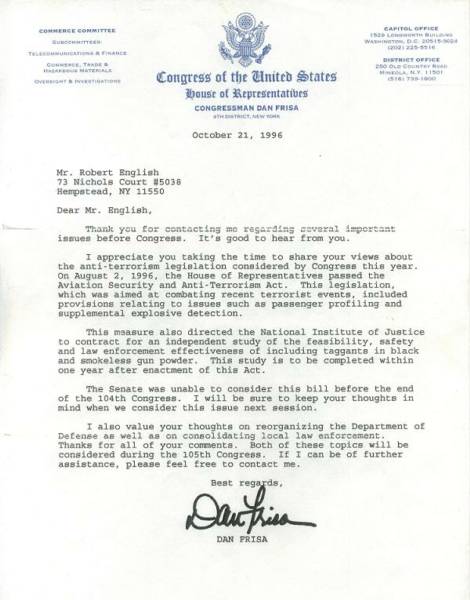 Between 1994 and 1995 I testified to congress through Dan Frisa, Nassau County, 4th District, House of Representative member about the inadequate security measures of the NYC Police Department, the potential for more terrorist attacks and some security lessons learned from the Vietnam War and how their implementation could save many innocent lives on Long Island. Since 1996 I have maintained direct communication with contacts at the defense department [Title 50 U.S.C. Internal Security of 1950] of any potential internal security problems.