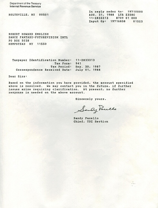 In 1985 working at Educational Technologies, Merrick, N.Y. I successfully bid a $10 million dollar contract for NYC school system in 1986. I was denied the promised 5% commission; reluctantly I took 1.5% and resigned. The next day in Mineola I filed business papers for DANCEFANTASY-Futurevision International. Re-organizing my DJ business Futurevision became the parent company as an A/ V consulting firm. IRS Lesson #6: Never work for people who don’t keep their word.