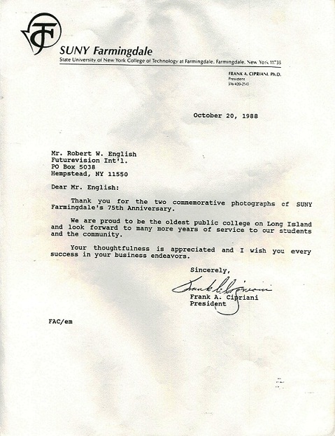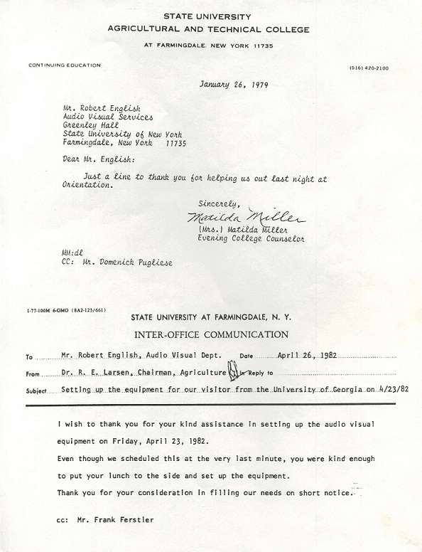 I Entered SUNY Farmingdale in Audio Visual Communications: Photo Tech, Electrical Tech, Engineering, Advertising Art, Air Conditioning, Business Management, Printing Machines & Audio Visual.